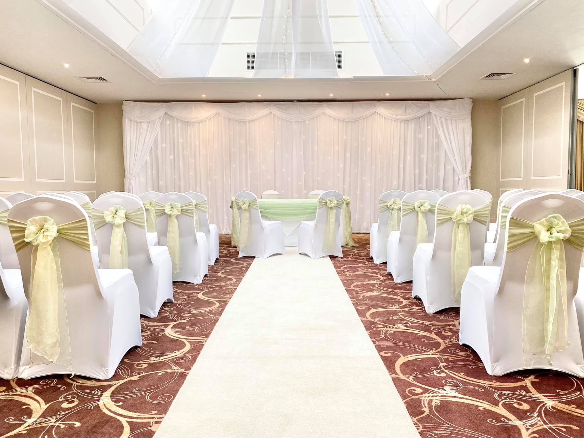 We have beautiful 7m wide fibre optic starlight backdrops. These are edged with side curtains and steamed for a crease free finish on set up to give you that perfect seamless look behind your top table.